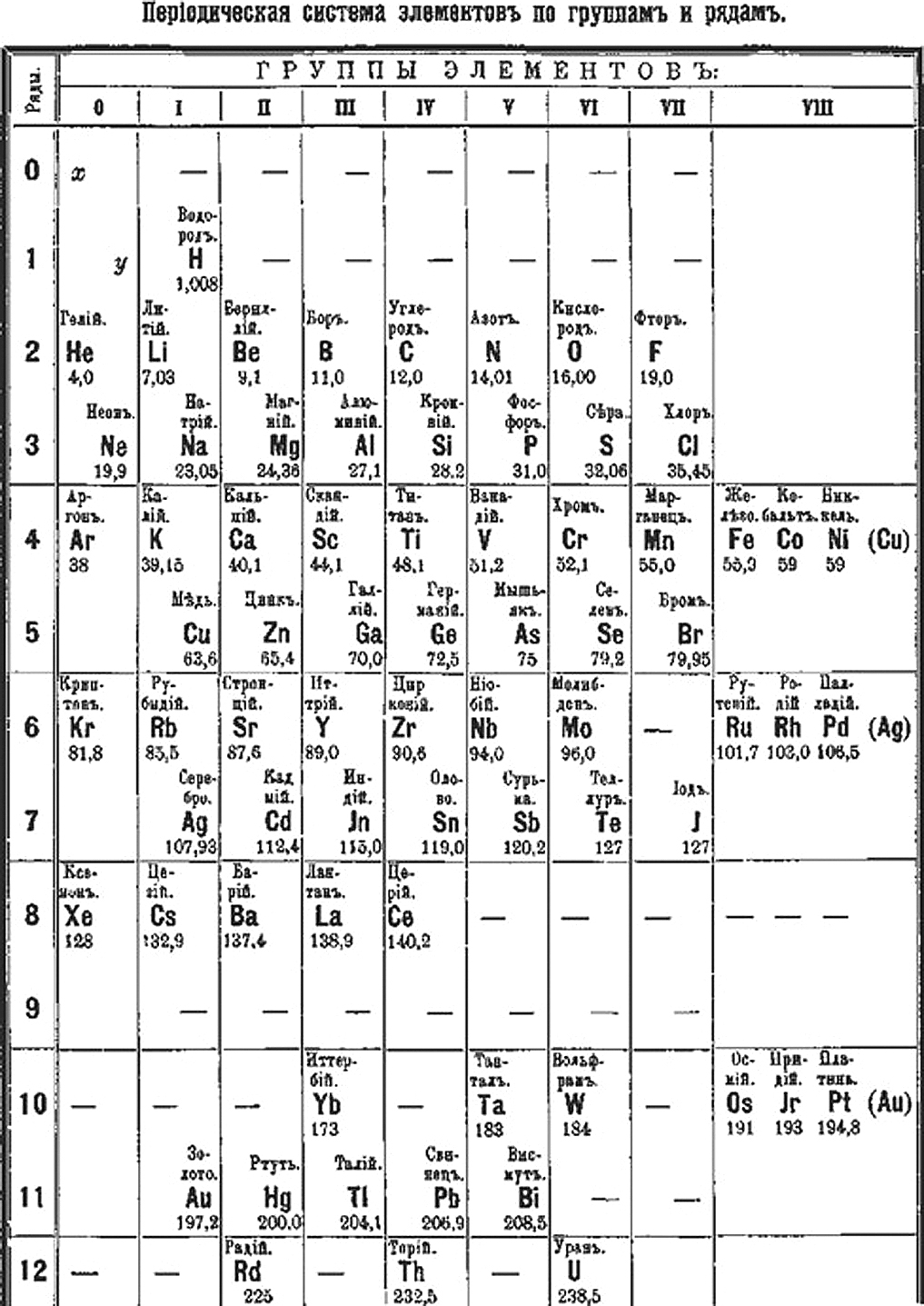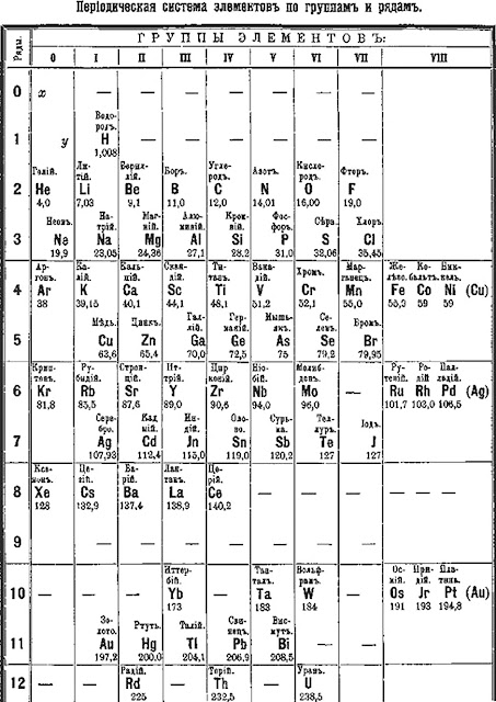 Mendělejev ve své práci píše, že „éter je nejlehčí – v tomto ohledu je hraniční – plyn, který má vysoký stupeň propustnosti„, „jeho částice mají poměrně malou hmotnost a mají vyšší rychlost translačního pohybu než jiné plyny„. Proto vědec oddělil éter do samostatné – nulové kolonky ve své slavné tabulce chemických prvků (později po smrti Dmitrije Ivanoviče byla tabulka na tomto místě odříznuta).